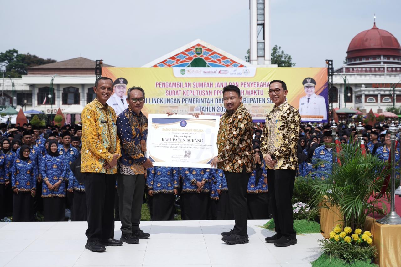 Usai prosesi inti, dilaksanakan penyerahan penghargaan dari BKN Regional III kepada Pemerintah Kabupaten Subang atas keberhasilan melakukan percepatan pengangkatan PPPK Paruh Waktu Formasi 2025, sebagai bentuk komitmen daerah dalam memperkuat sistem kepegawaian yang profesional dan akuntabel.