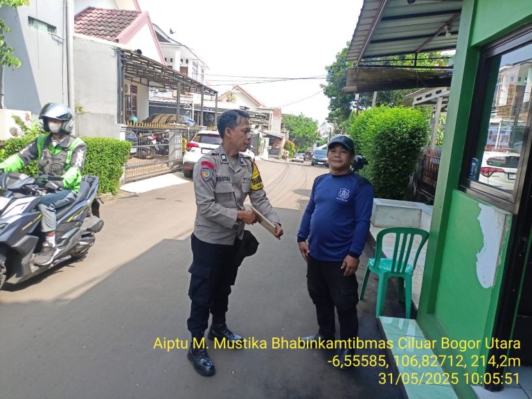 Kota Bogor, Pesanjabar.com – Dalam rangka memperkuat keamanan dan ketertiban di lingkungan permukiman, Bhabinkamtibmas Kelurahan Ciluar, Aiptu Maulana Mustika, kembali melaksanakan giat patroli wilayah sekaligus sambang dialogis ke Pos Satpam Perumahan Bumi Ciluar Asri yang berlokasi di Jl. Wijaya Kusuma, RW 08, Kelurahan Ciluar, Kecamatan Bogor Utara, Kota Bogor (31/05).