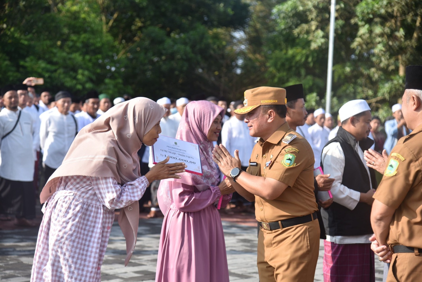 KUNINGAN. pesanjabar.com – Pemerintah Kabupaten Kuningan kembali menunjukkan komitmennya dalam membangun masyarakat religius dan berdaya dengan menyerahkan insentif kepada 1.000 guru ngaji dan imam tajug dari seluruh kecamatan se-Kabupaten Kuningan. Penyerahan dilakukan langsung oleh Bupati Kuningan Dian Rachmat Yanuar saat apel pagi lingkup Setda, Senin (23/06/2025).