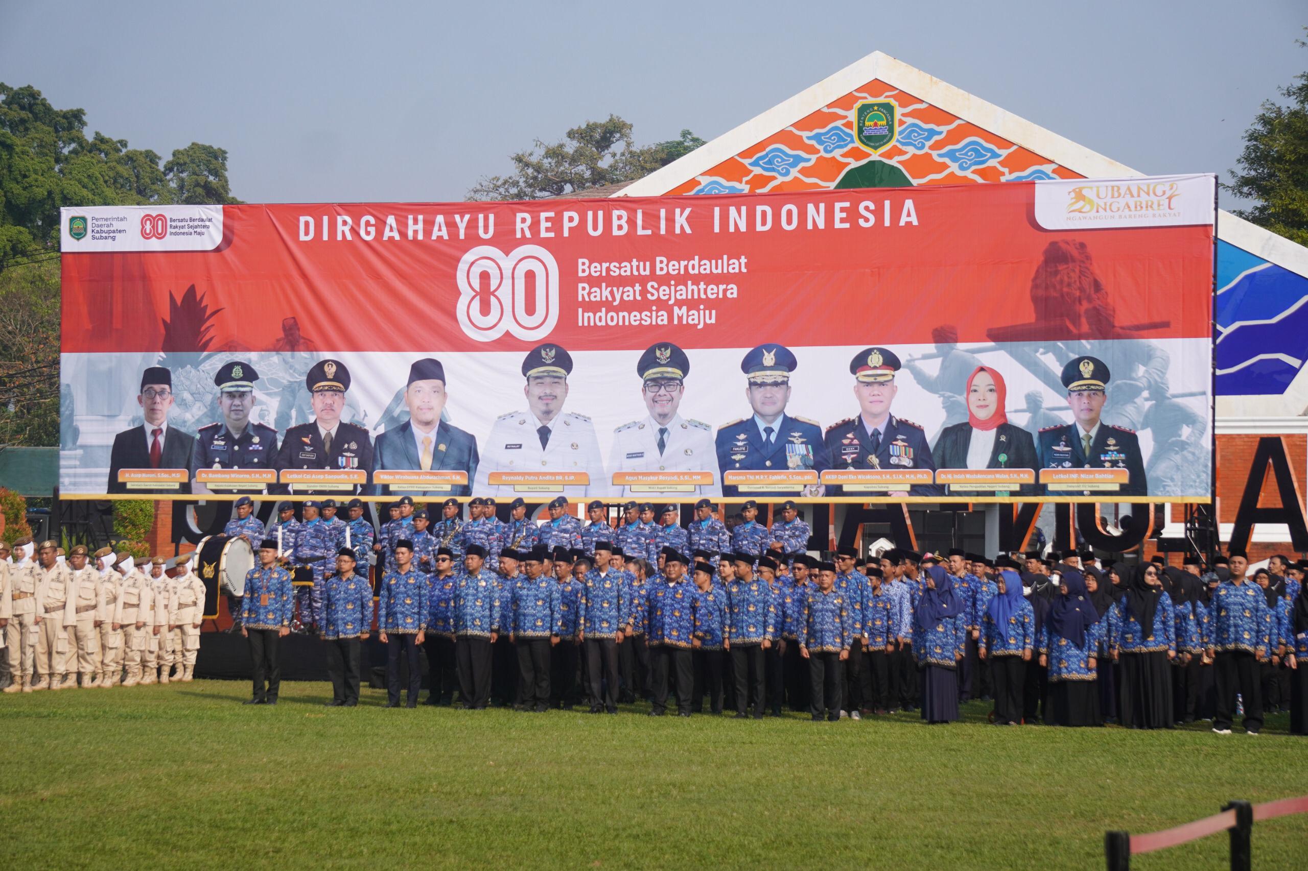 Upacara peringatan HUT ke-80 RI di Subang ini turut dihadiri jajaran Forum Koordinasi Pimpinan Daerah (Forkopimda), perwakilan instansi vertikal, akademisi, pimpinan perusahaan dan perbankan, serta tamu undangan lainnya. Suasana penuh kebersamaan tersebut menjadi momentum refleksi sekaligus tekad bersama untuk membawa Kabupaten Subang menuju masa depan yang lebih baik. (**)