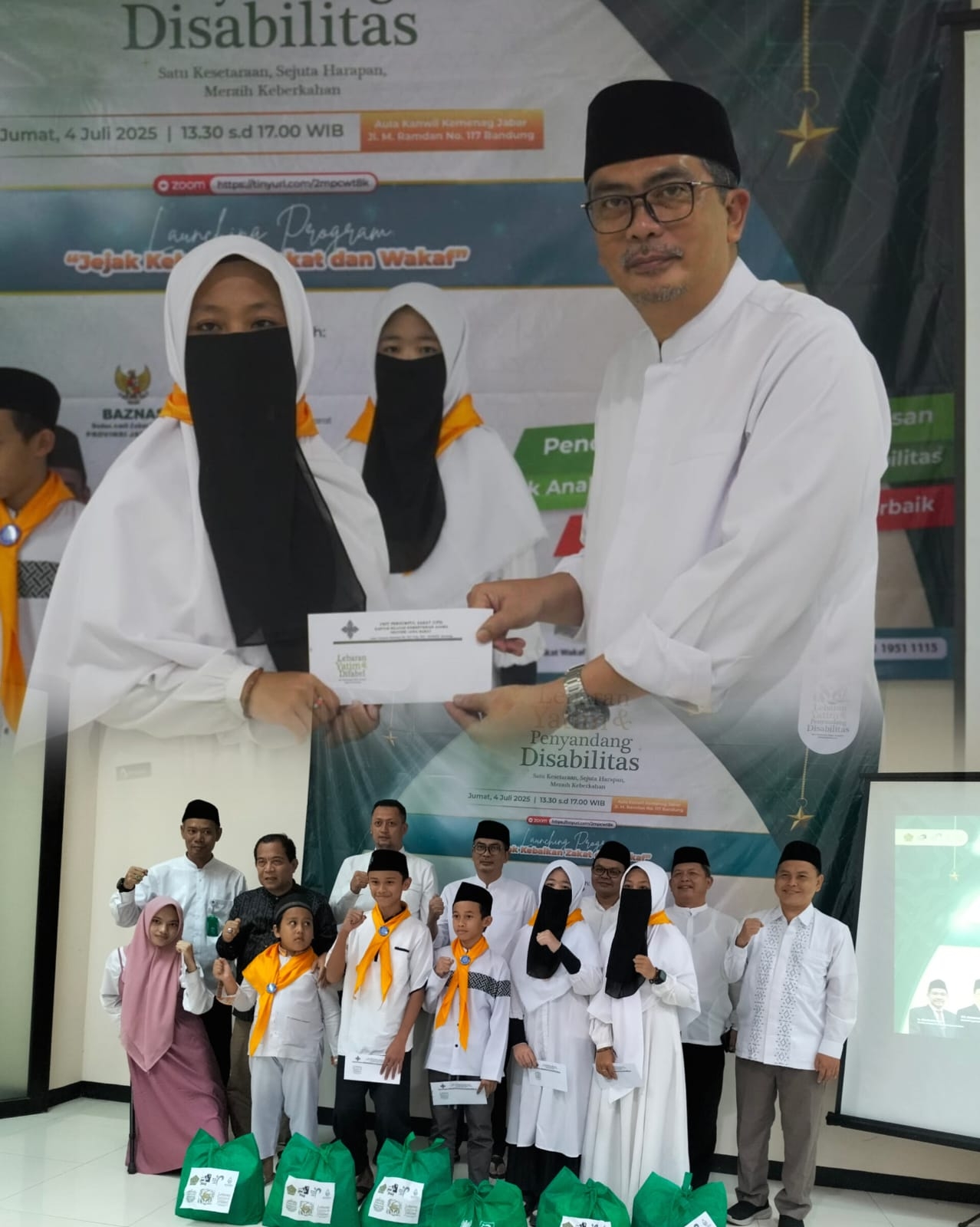 BANDUNG, Pesanjabar.com — Wilayah Kementerian Agama (Kanwil Kemenag) Provinsi Jawa Barat menyalurkan bantuan berupa 2.000 bingkisan sembako serta uang tunai masing-masing Rp150 ribu kepada anak-anak yatim dan penyandang disabilitas pada Jumat, 4 Juli 2025. Penyerahan secara simbolis dilakukan kepada 20 orang penerima yang hadir di Aula Kanwil Kemenag Jabar di Jl. Moh. Ramdan, Kota Bandung. Kegiatan ini terlaksana atas kerja sama antara Kemenag Jabar, Lembaga Amil Zakat (LAZ), dan Badan Amil Zakat Nasional (Baznas) Provinsi Jawa Barat. Adapun pembagian bingkisan lainnya dilakukan secara serentak di seluruh kabupaten dan kota di wilayah Jawa Barat.