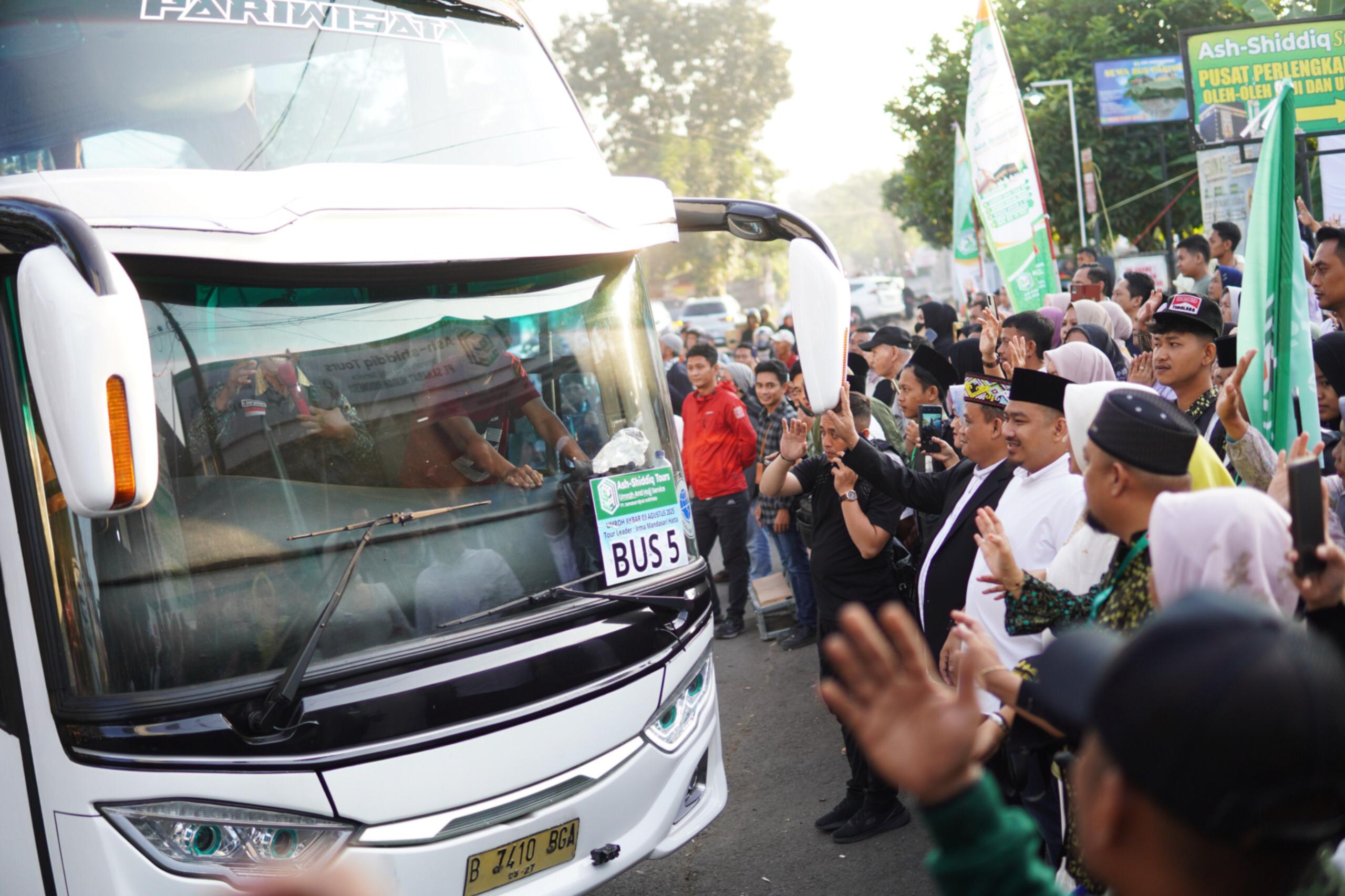 Setelah sambutan, dilakukan pelepasan resmi 9 bus rombongan jamaah umrah oleh Kang Rey dan Hj. Elita Budiati atau yang akrab disapa Bunda Elita.