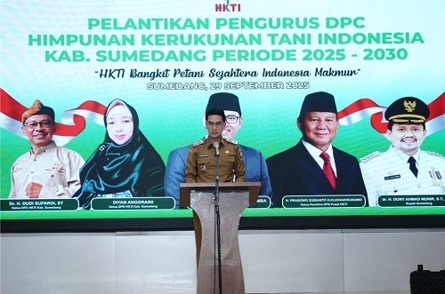 Wakil Bupati Sumedang, Fajar, menyampaikan keyakinannya bahwa langkah ini, ditambah dengan sinergi bersama Himpunan Kerukunan Tani Indonesia (HKTI), akan membawa perubahan signifikan bagi kesejahteraan petani. “Pemkab Sumedang memiliki lima fokus terobosan di bidang pertanian. Saya optimis, kerja sama dengan HKTI bukan hanya meningkatkan produksi, tetapi juga menghadirkan kesejahteraan yang lebih luas bagi para petani di Kabupaten Sumedang,” ujarnya saat menghadiri pelantikan pengurus DPC HKTI Sumedang periode 2025–2030 di Aula Tampomas, PPS, Senin (29/9).