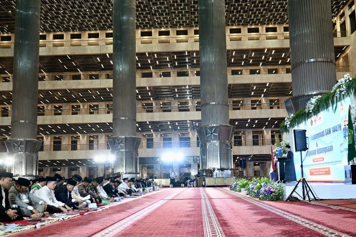 JAKARTA.pesanjabar.com — Menteri Agama Nasaruddin Umar menghadiri Peringatan Maulid Nabi Muhammad SAW 1447 H yang dirangkai dengan Istighosah Kebangsaan di Masjid Istiqlal, Jakarta, Kamis (4/9/2025). Dalam acara yang turut dihadiri Presiden Prabowo Subianto, Wakil Presiden Gibran Rakabuming Raka, jajaran menteri Kabinet Merah Putih, duta besar, ulama, tokoh agama, serta masyarakat umum itu, Menag memperkenalkan konsep ekoteologi—ajaran yang menekankan keseimbangan antara manusia, alam, dan Sang Pencipta.