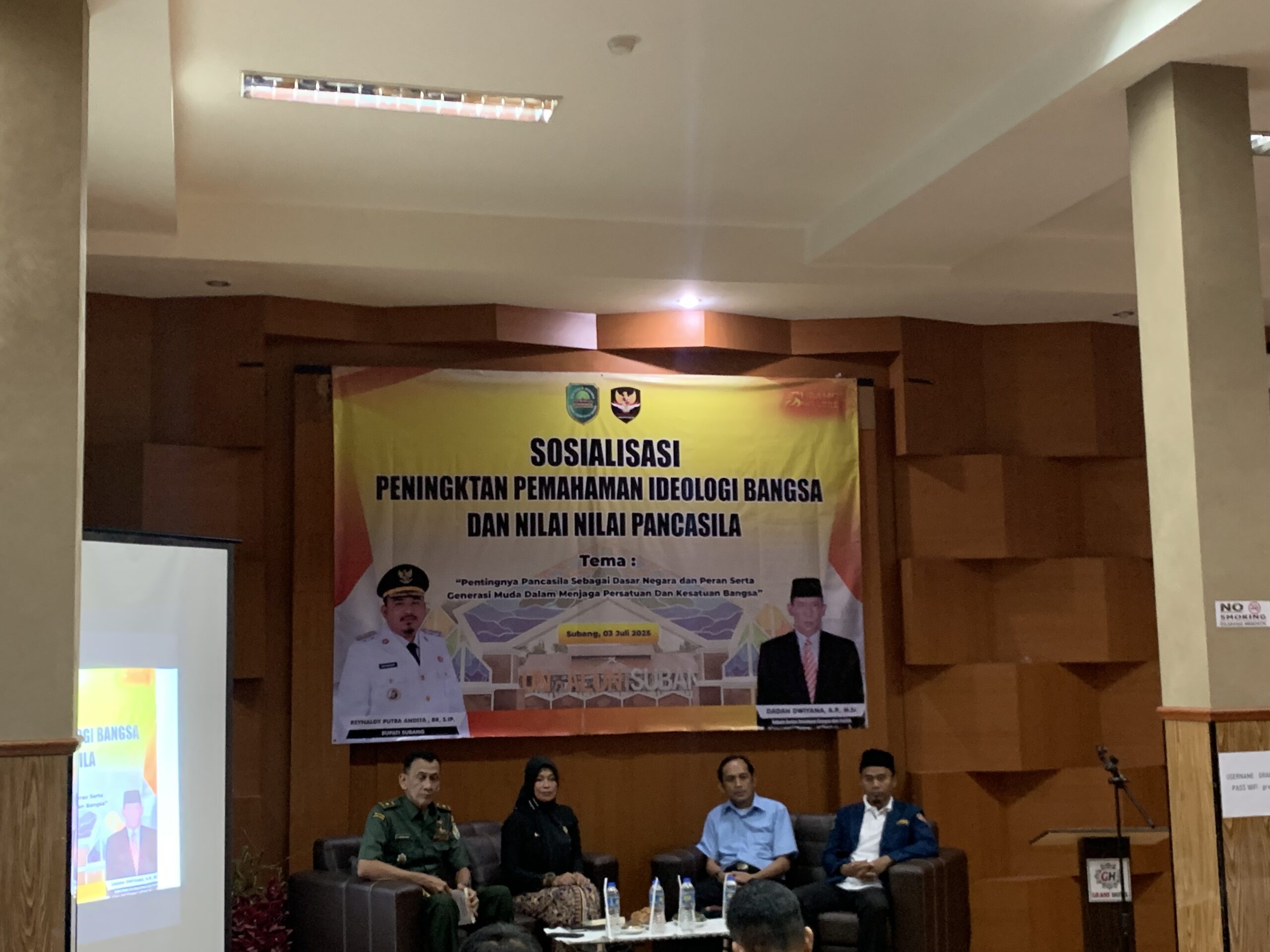 SUBANG, Pesanjabar.com – Badan Kesatuan Bangsa dan Politik (Kesbangpol) Kabupaten Subang kembali menunjukkan komitmennya dalam memperkuat pemahaman ideologi kebangsaan dengan mengadakan kegiatan sosialisasi bertajuk “Pentingnya Pancasila Sebagai Dasar Negara dan Peran Serta Generasi Muda Dalam Menjaga Persatuan dan Kesatuan Bangsa”. Acara ini berlangsung meriah di Aula Grand Hotel Subang pada Kamis, 3 Juli 2025.