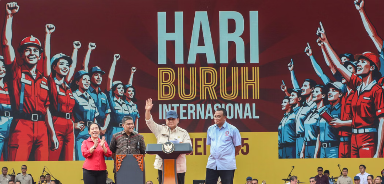 Presiden Prabowo Subianto tampak didampingi Presiden Konfederasi Serikat Pekerja Indonesia (KSPI) sekaligus Presiden Partai Buruh, Said Iqbal, serta Presiden Konfederasi Serikat Buruh Seluruh Indonesia.