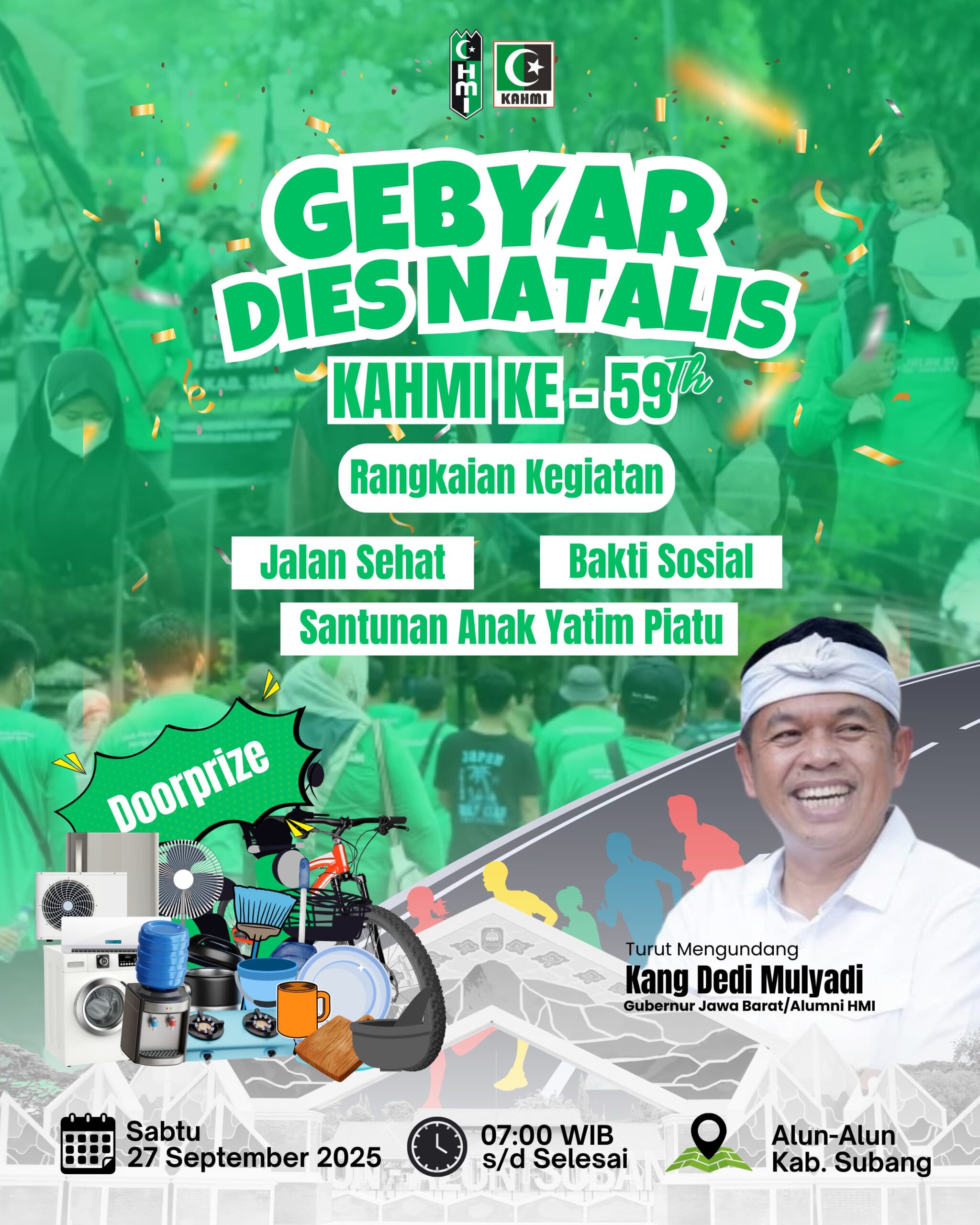 SUBANG.pesanjabar.com – Dalam rangka memperingati Milad Korps Alumni Himpunan Mahasiswa Islam (KAHMI) ke-59, Majelis Daerah (MD) KAHMI Kabupaten Subang bersama keluarga besar HMI, KOHATI, dan FORHATI akan menggelar kegiatan jalan sehat pada Sabtu, 27 September 2025.
