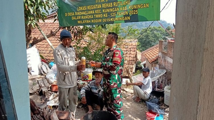 KUNINGAN.pesanjabar.com – Program TNI Manunggal Membangun Desa (TMMD) ke-125 Kodim 0615/Kuningan kembali melaksanakan perbaikan Rumah Tidak Layak Huni (Rutilahu) di Desa Sindangjawa, Kecamatan Kadugede, Senin (11/8/2025).