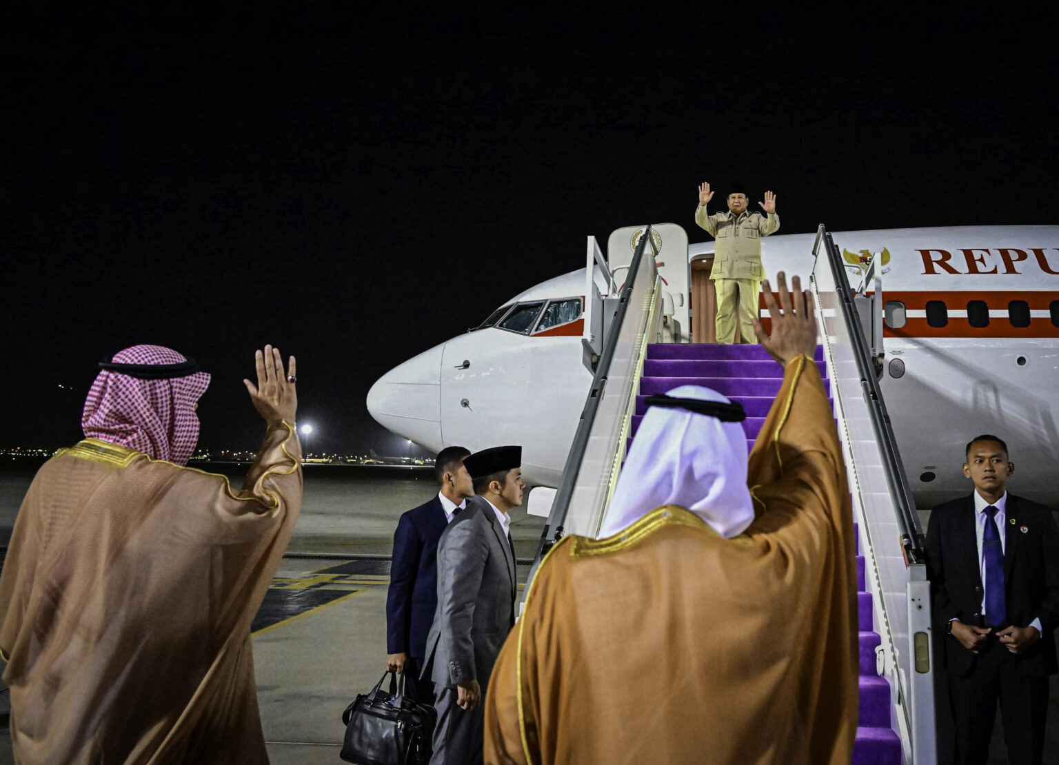 Keberangkatan Presiden Prabowo dilepas oleh Wakil Gubernur Mekkah, Pangeran Suud bin Mis’al bin Abdul Aziz Al-Saud, Duta Besar RI untuk Arab Saudi Abdul Aziz, serta Atase Pertahanan KBRI Riyadh Brigjen Eri Nasuhi.